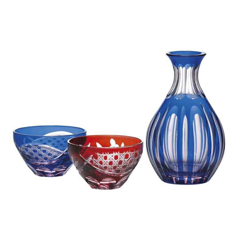 送料無料 ラッピング無料 大塚硝子 江戸切子 十草 酒器セット 87-151-3 (ぐい飲みx2、徳利x1)木箱入り 日本製 Made in Japan