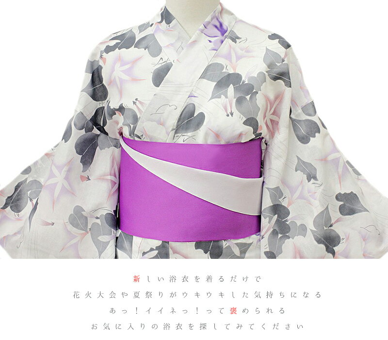 帯はいろいろな種類からお好きなものをお選びいただけるので、 あなた好みのコーディネートをお楽しみいただけます! 浴衣のお色は、上品な白地。