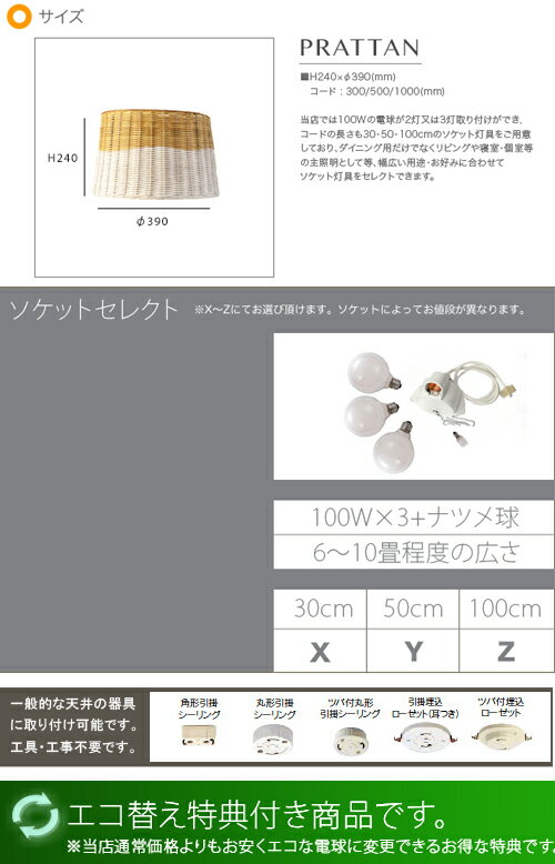 商品データ ■素材:ラタン ■サイズ:φ390×H240(mm) ■ソケットセレクト X:3灯+豆球/300mmコード Y:3灯+豆球/500mmコード Z:3灯+豆球/1000mmコード ■電球セレクト:選べます!! ※各電球についてはセレクトボックス記載の[記号]をコチラにて照合しご確認下さい。